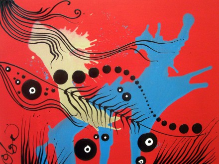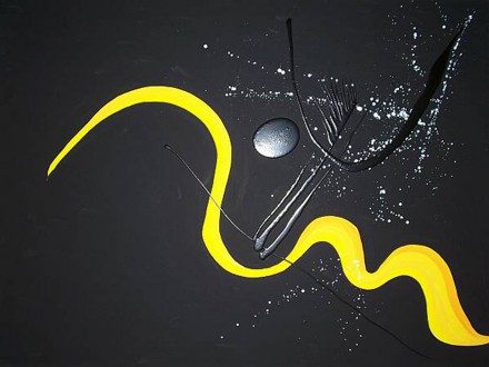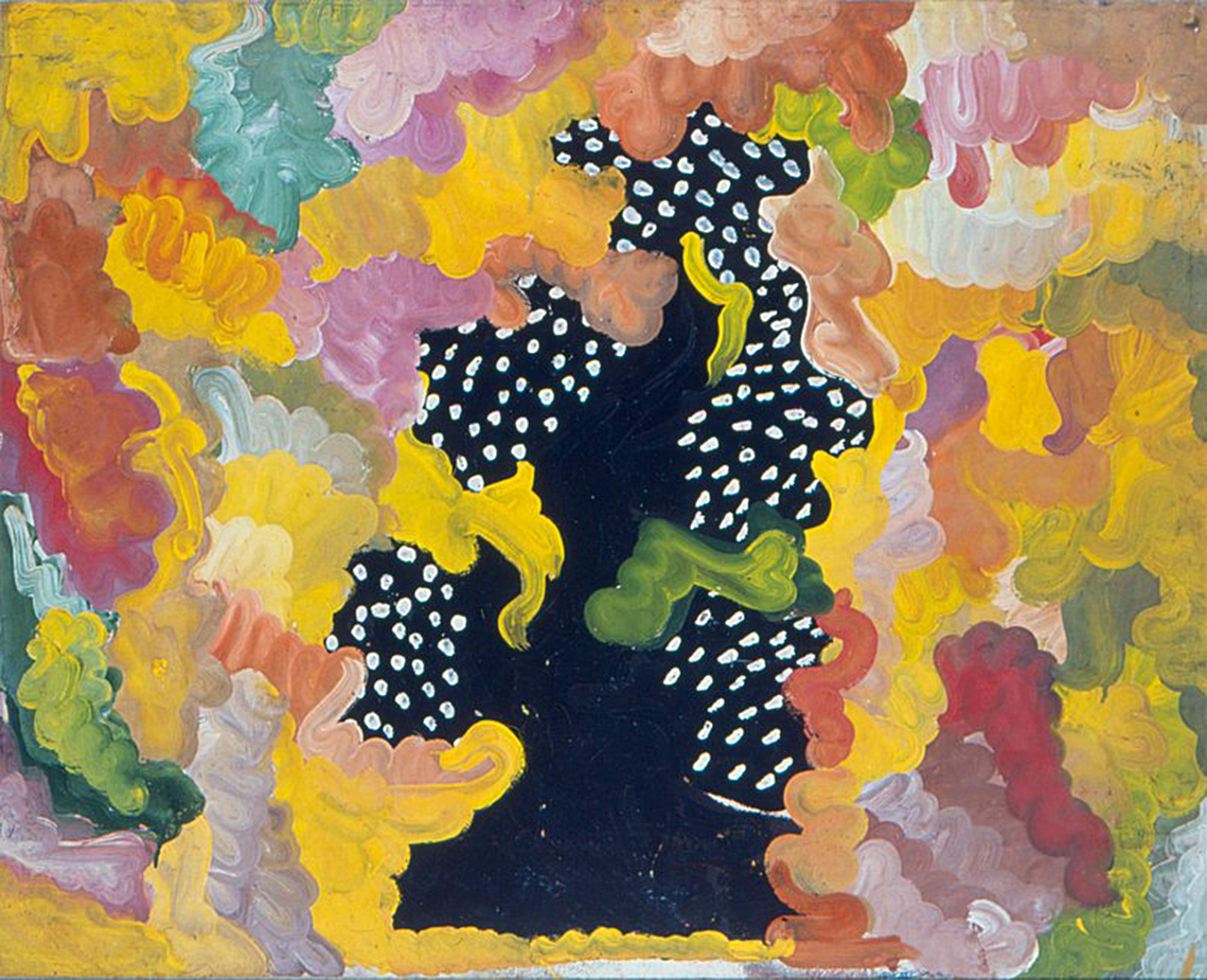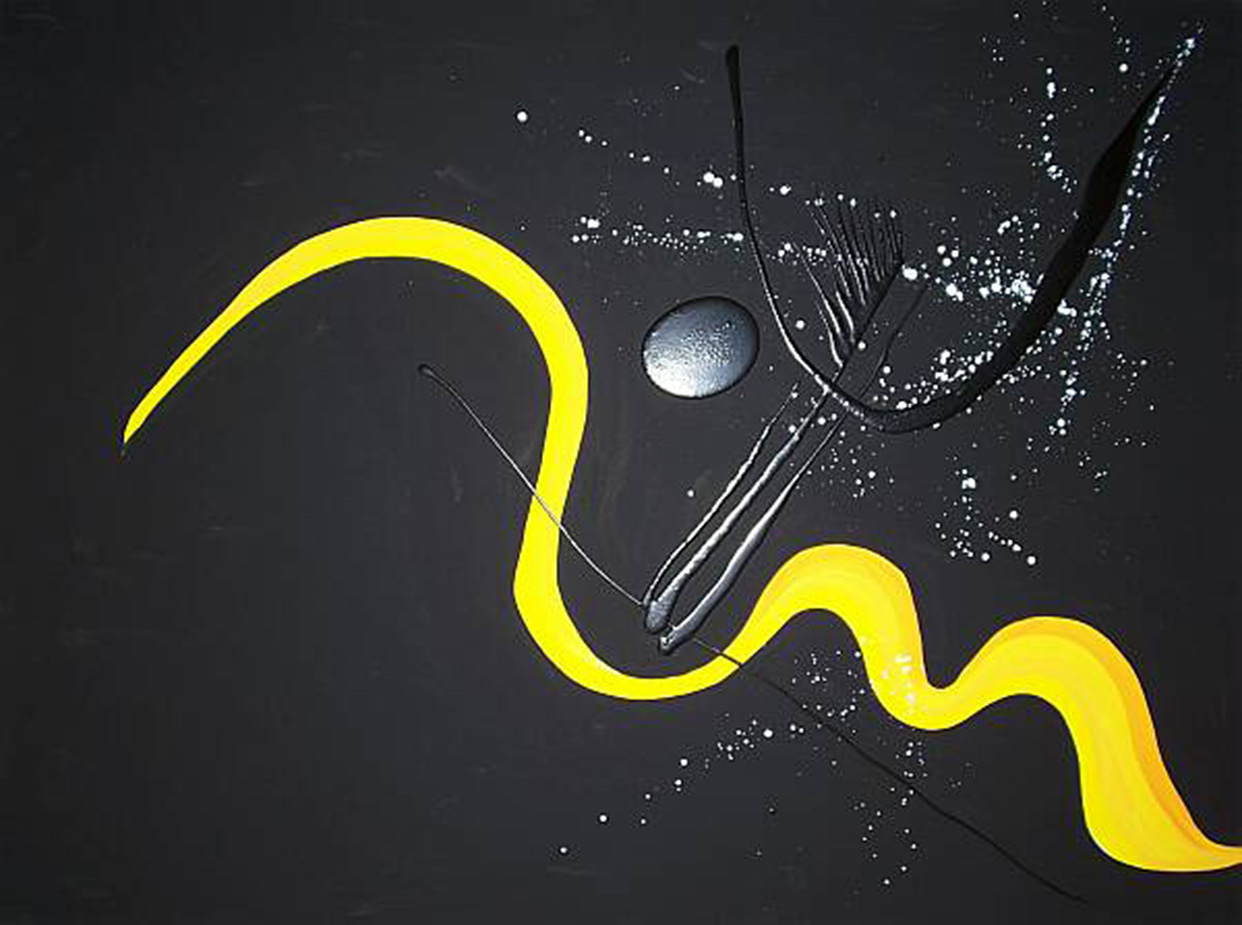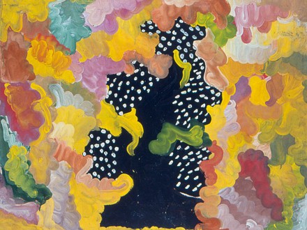 A dozen exuberant same-size canvases in a range of rich, brilliant colors are hung on the room's curving wall, an especially nice way to set off the large works which are filled with curves themselves.