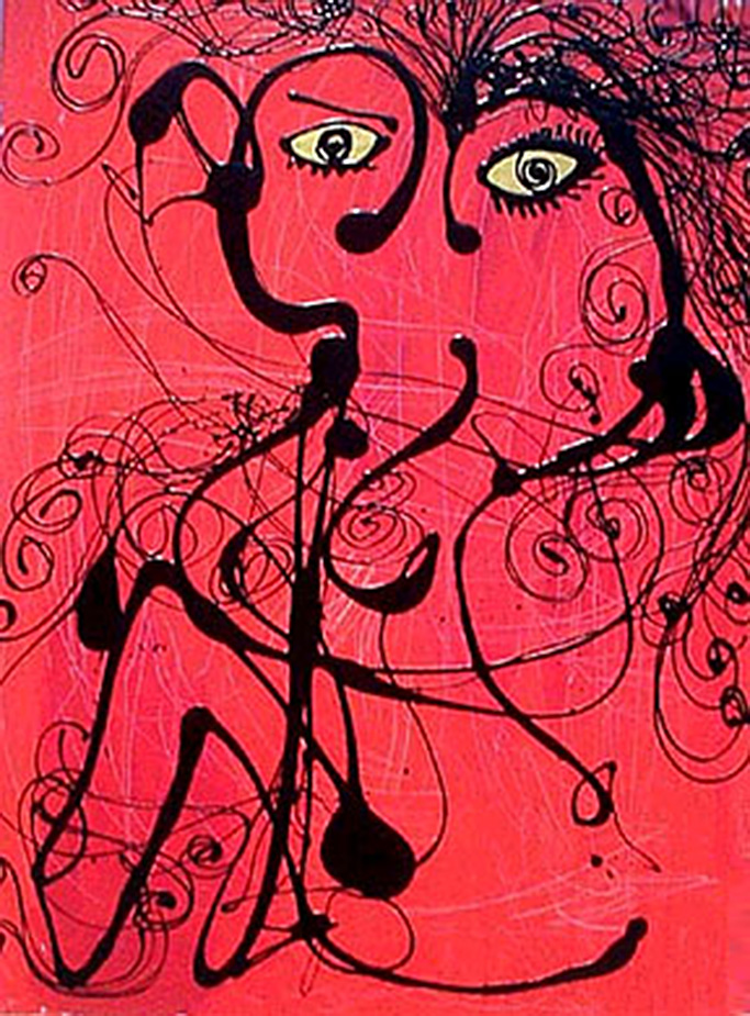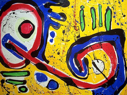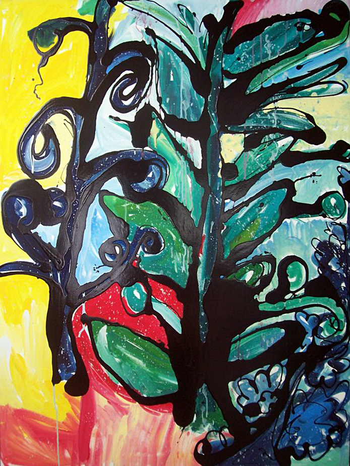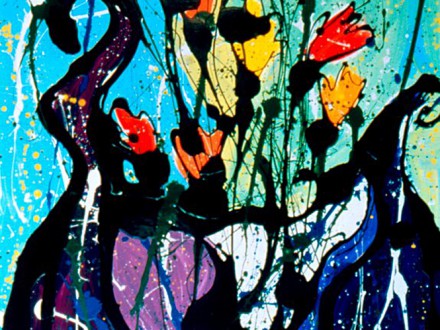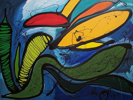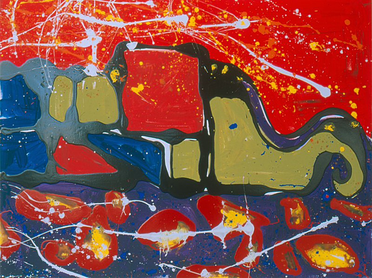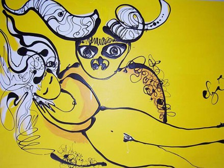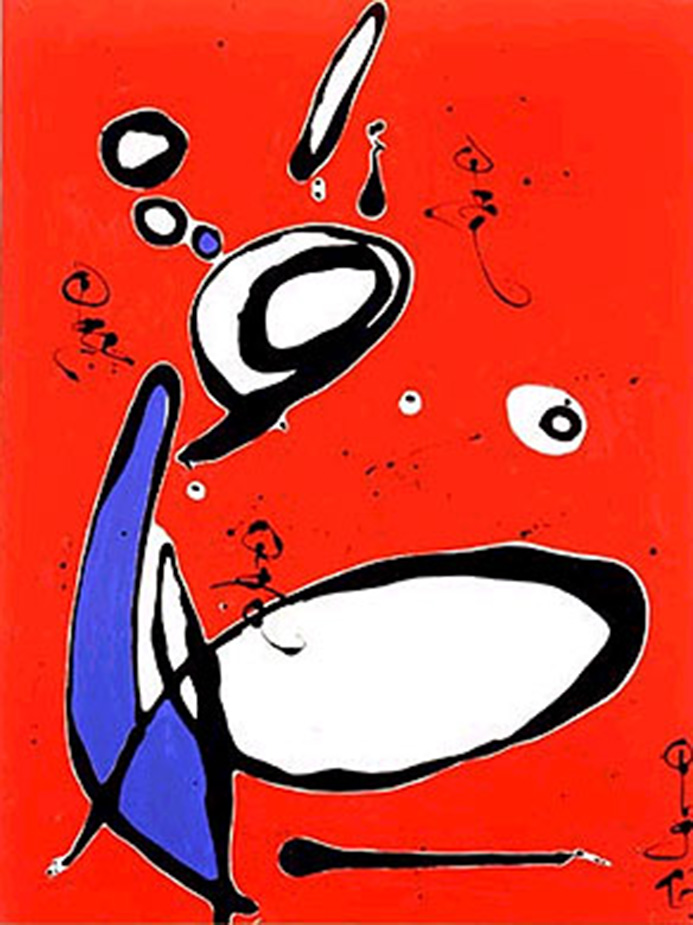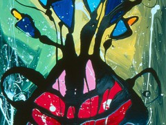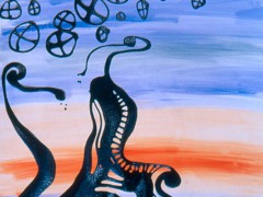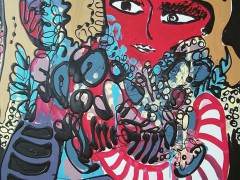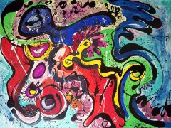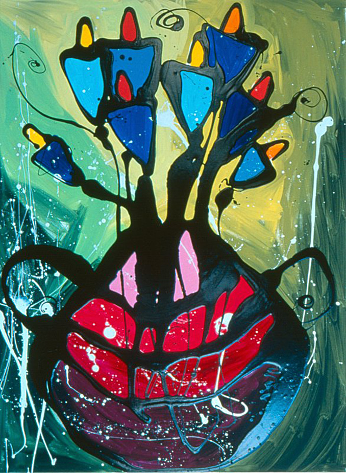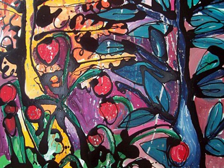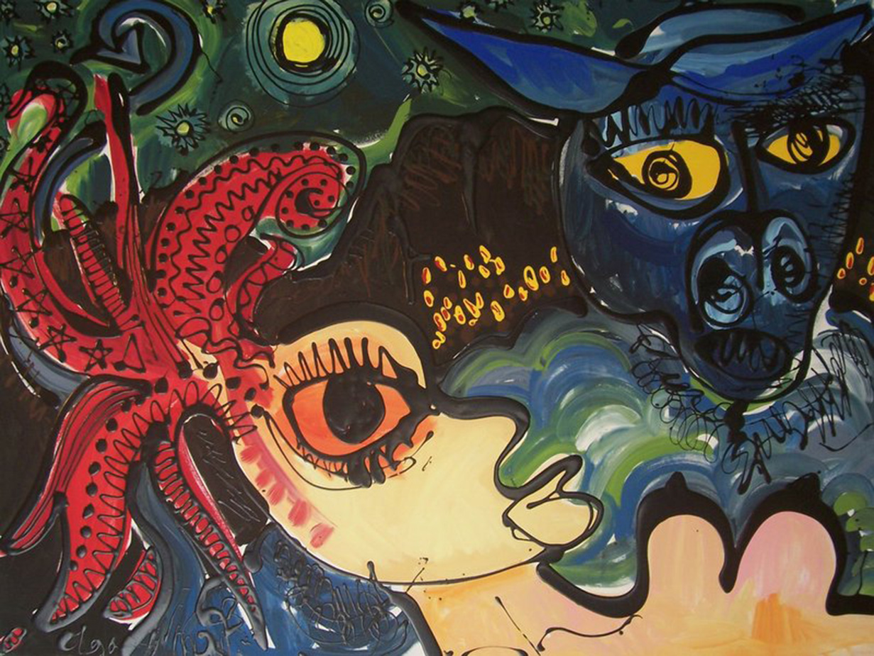 The broad and vivid fantesies depicted in a wonderful combination of rich colours and the emphatic black lines produce complex, intriguing forms that stimulate a viewer's imagination.